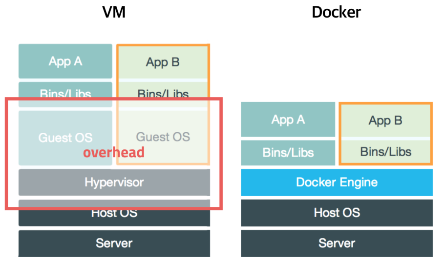 - 이미지 생성/배포 시간이 가상 머신에 비해 빠르며 가상화된 공간을 사용할 때 성능 손실이 거의 없다