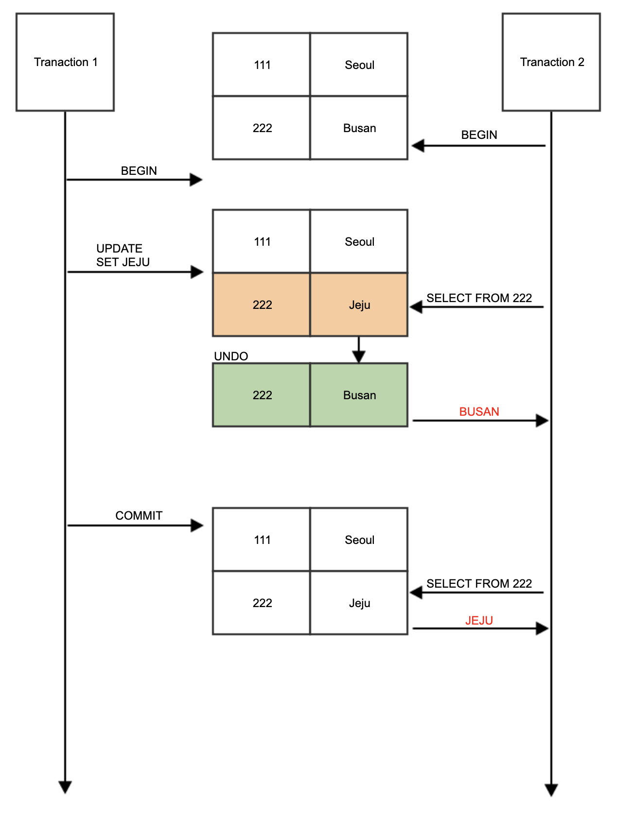 - 트랜잭션이 시작하기 전 마지막 commit된 데이터만 조회 가능